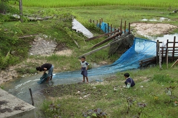 ラオスやタイの人たちにとっては魚や香草を採る場所でもあります。水田での漁労は、雨季の大事な食料確保の手段となっています。 水田は、単に稲を育てるところではないのです。