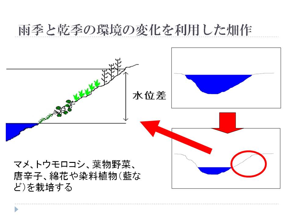 乾燥の厳しい季節、普通の畑では水の確保が問題となりますが、この川岸畑はその心配がありません。また、雨季の間に毎年自然に表土が更新されるので、人工的な施肥のほとんど必要のない、環境負荷も投資額も少なくてすむ畑となるのです。
